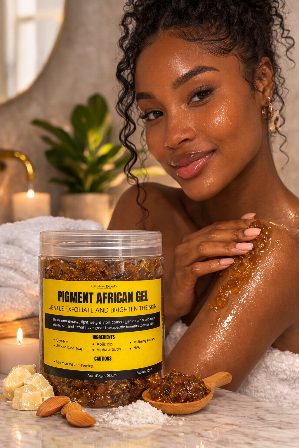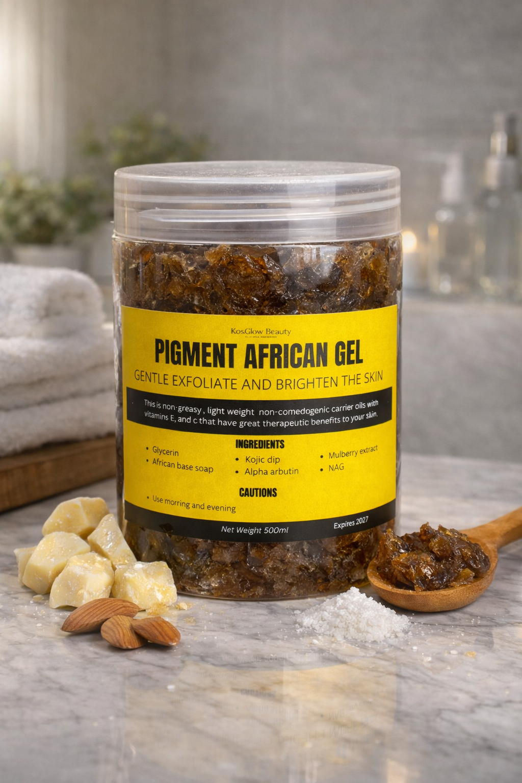 Pigment African Gel is a powerful yet gentle exfoliating skincare product designed to brighten and even out the skin tone. Formulated with effective ingredients like kojic dip, alpha arbutin, mulberry extract, and N-acetyl glucosamine (NAG), this gel helps reduce the appearance of dark spots, pigmentation, and dull skin. Enriched with glycerin and African-based soap, it works to cleanse, exfoliate, and refresh the skin while maintaining moisture. With regular use, your skin appears smoother, clearer, and more radiant.